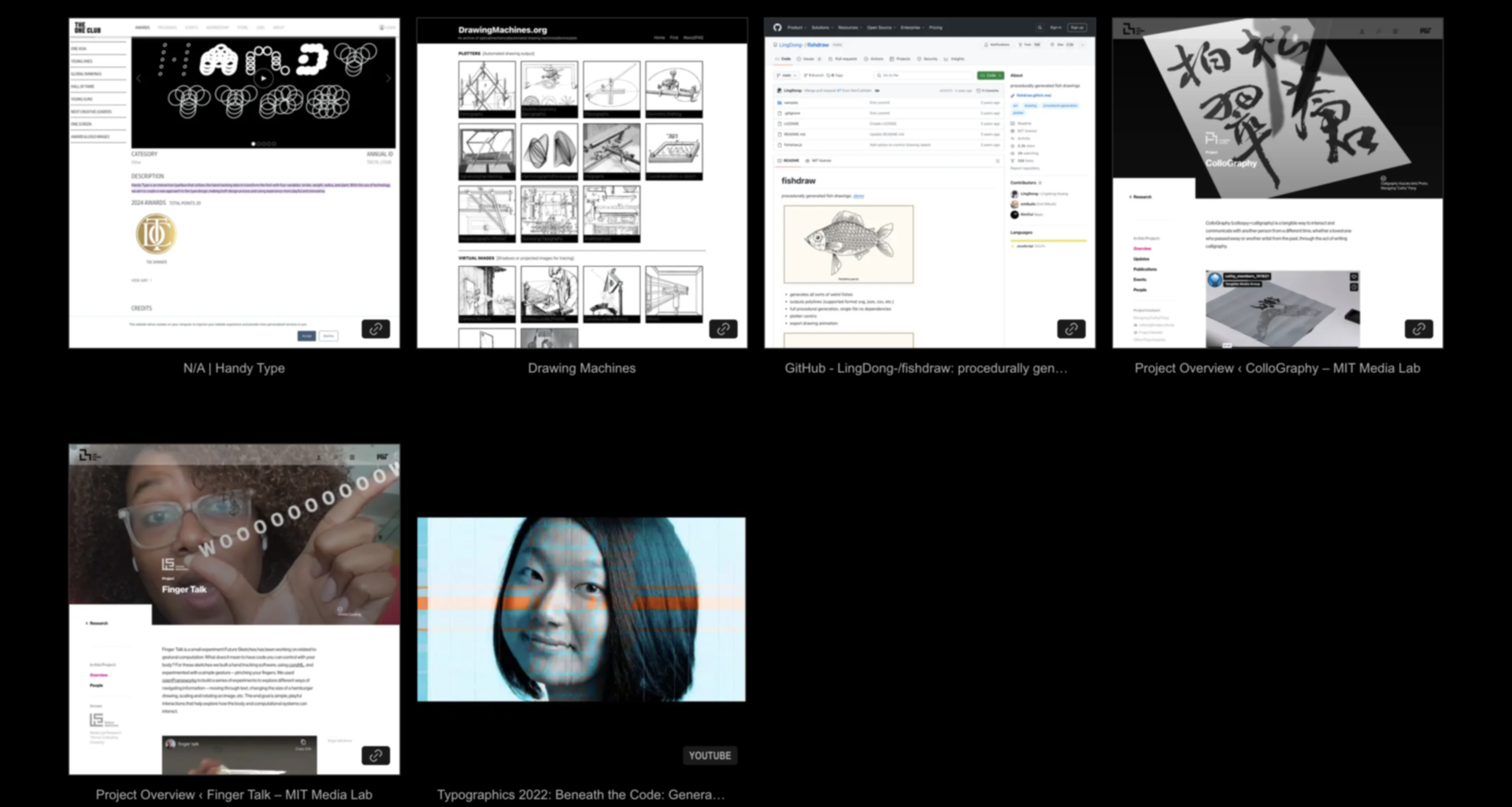 When I feel stuck, I’ve realized that getting inspired again helps me shift my thinking and approach solutions in new ways. So, I started looking for projects to use as case studies or sources of inspiration for my own work. I revisited a few references shared in the slides and found Zach Lieberman’s talk at MUDA especially captivating. I’ve followed his work for a while, but many of the projects he discussed were new to me and really piqued my interest. ( Zach Lieberman projects with captions here)