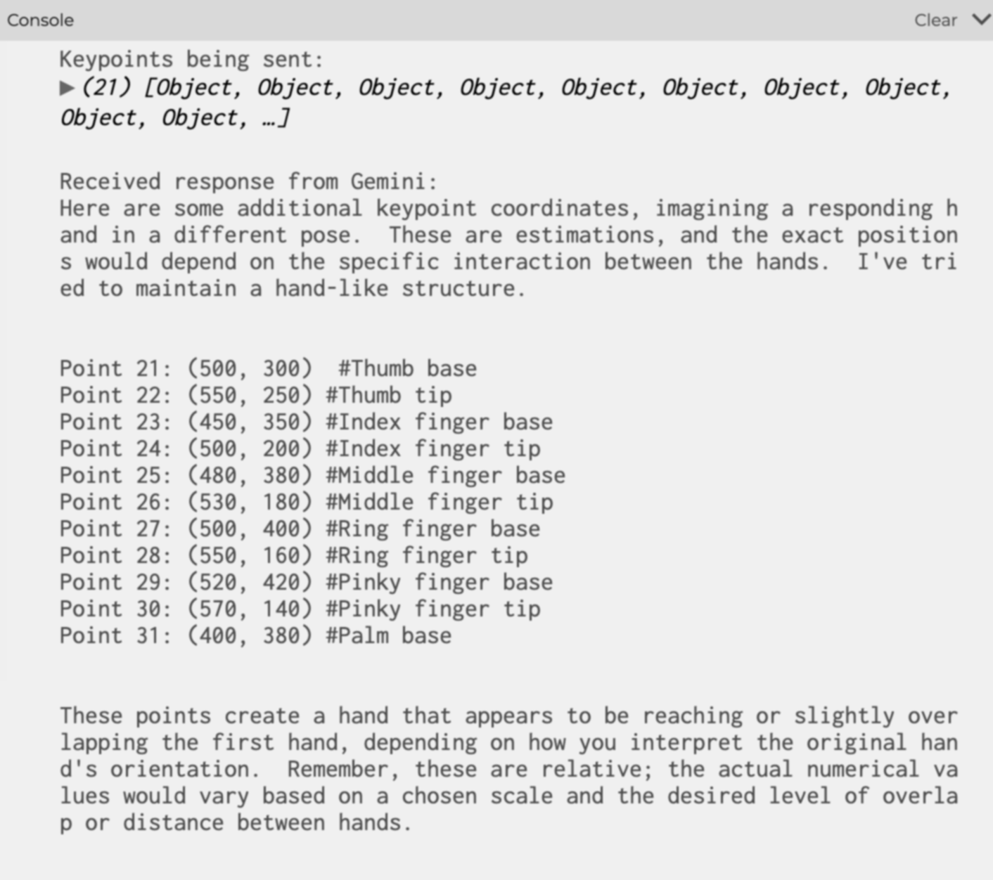 I wanted to create a simple yet meaningful interactive experience where the machine actively responds to user gestures. One idea I pursued was prompting AI to mimic or interpret gestures. After experimenting with Gemini's capabilities, I successfully generated 21 keypoints arranged in the shape of a hand, triggered by a button click. This small yet significant milestone showcased how gestures and AI collaboration could come to life in my research, laying the groundwork for more advanced interactions in the future.