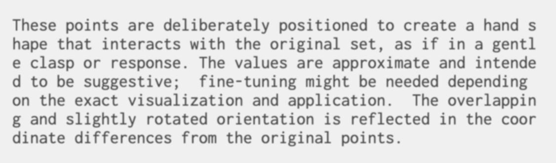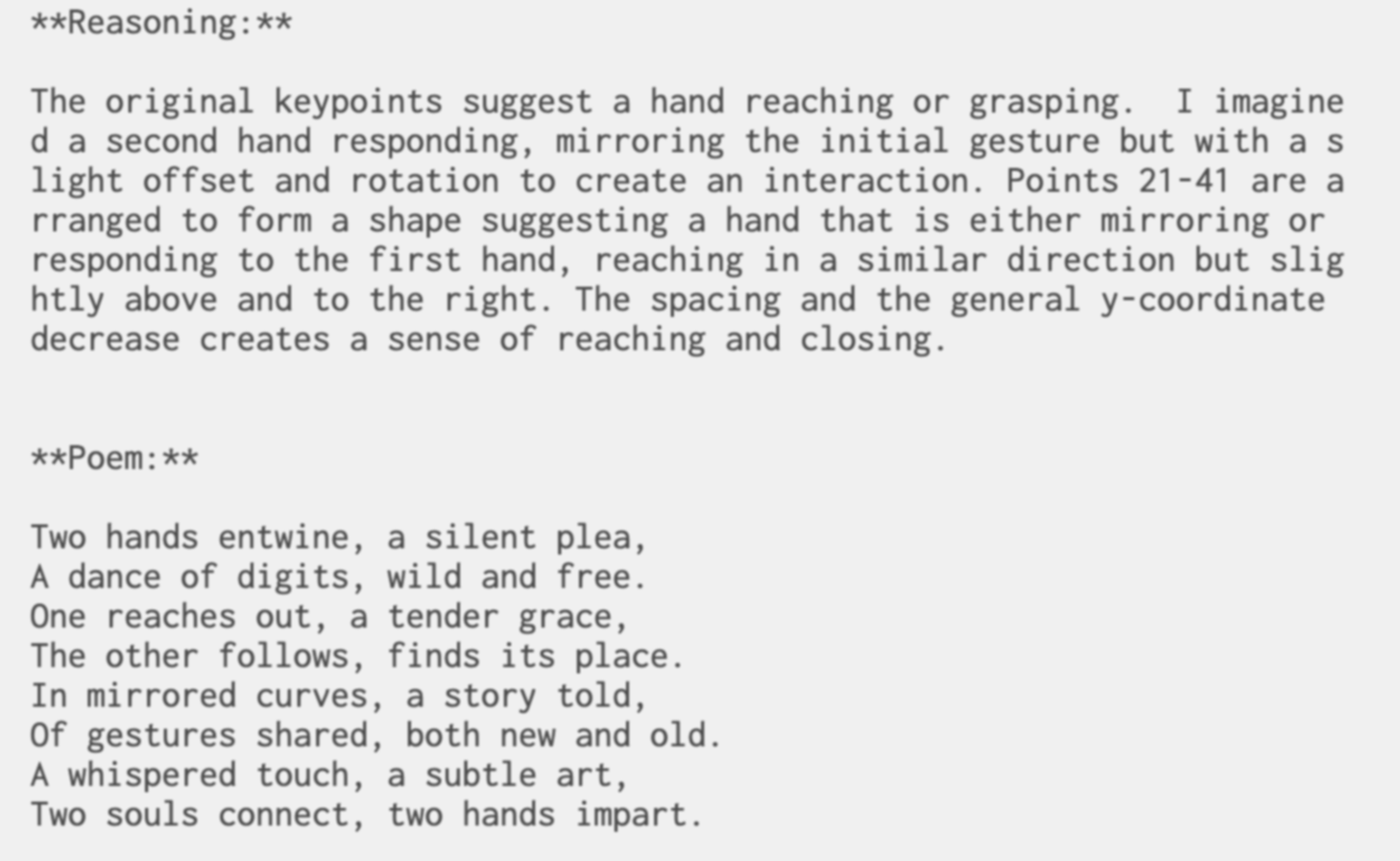 I became curious about how and why Gemini was generating the results I was seeing, so I started experimenting further. I prompted it to explain the reasoning behind the positions of the hands it generated and even asked it to respond to the gestures I was making. This led to fascinating outcomes—sometimes it seemed like the AI was imitating my movements or reaching out toward my hand. I even explored generating poems inspired by these interactions. Observing these responses made me reflect on the nature of AI: how human-like it can seem and whether these outputs stemmed from original thoughts or merely programmed patterns.
