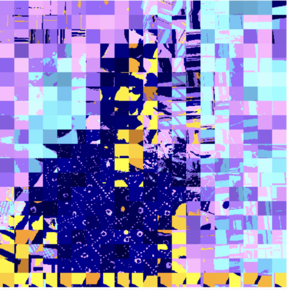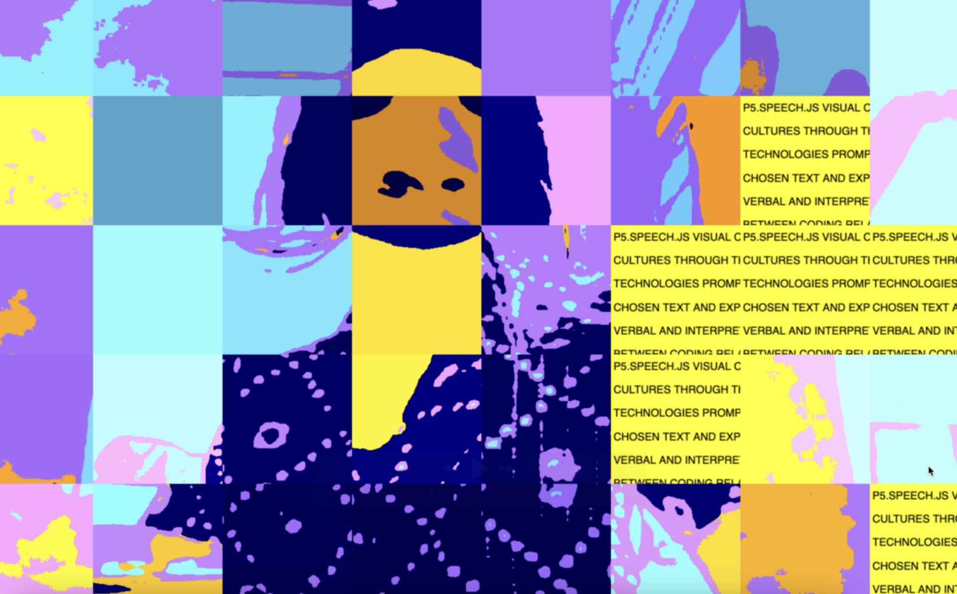With the exhibition opening just a week away and TouchDesigner off the table, I shifted gears to create two new sketches for the screens using p5.js. Thankfully, I already had a clear vision of the visuals I wanted, so I dove right in. For the first screen, the goal was to recreate the visual style of the exhibition poster that Andreas had designed. Unfortunately, he couldn’t find the original sketch he used, so I had to improvise and replicate it myself. I decided to divide the webcam feed into grid cells, tweak their saturation and color levels, and randomly rotate a few cells by 90, 180, or 270 degrees. The result was a dynamic, print-like effect that reminded me of screen prints or risographs.