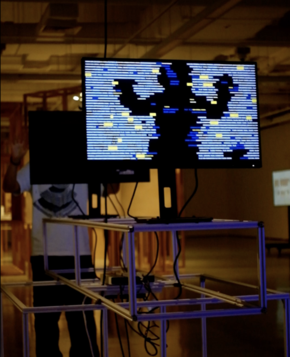 For the second screen, we opted for a more text-based outcome but wanted it to still feel connected to the first screen. I decided to use the same text for both, which would be pulled from the project descriptions for the exhibition. Inspired by Ksawery Komputery’s work, I used ml5’s body segmentation function to create a shadow-like effect where the changing text would fill the screen.