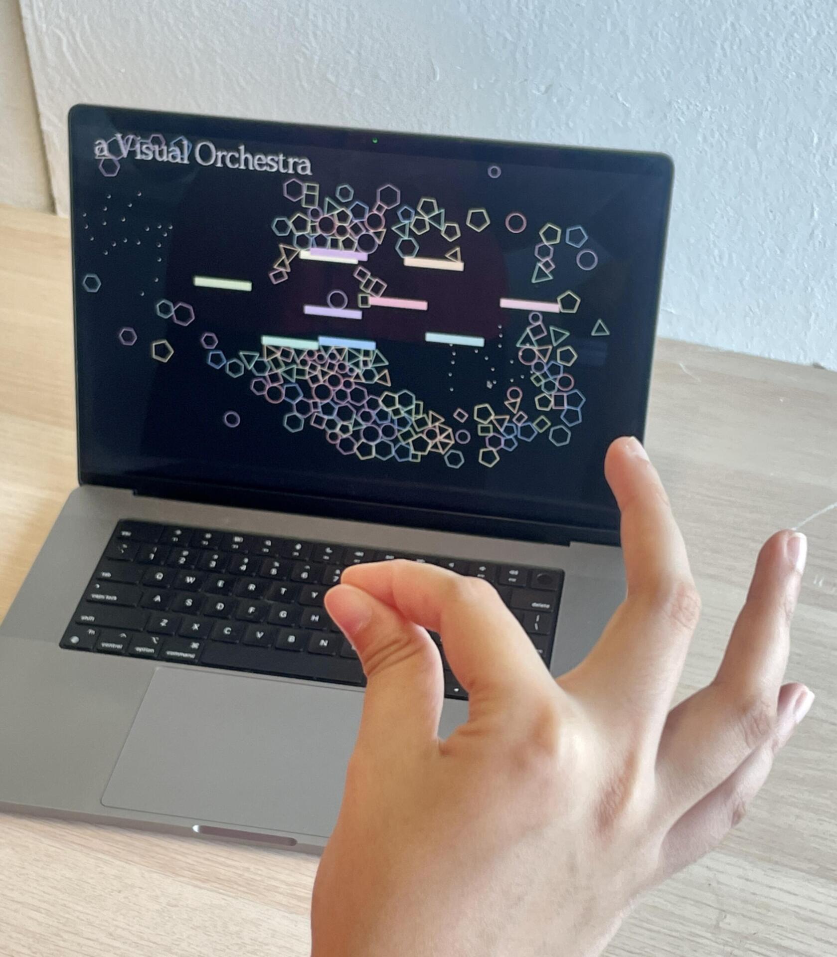 With this foundation in place, I started developing what I called a "visual orchestra." I created various shapes using Matter.js and placed them within a bounded window to keep them from falling off the screen. These borders were static and acted like invisible walls that would deflect the objects back into view. The real magic happened when I incorporated the pinch gesture: whenever the system detected a pinch, it would create a magnetic effect, drawing different shapes toward the pinched fingers. To keep things interesting, I built a second version where the hands acted as repellent magnets, pushing the objects away when they got too close. I also added a feature where, if the pinch gesture was held for three seconds, the user could create a static rectangular body that would cause other objects to deflect off it.