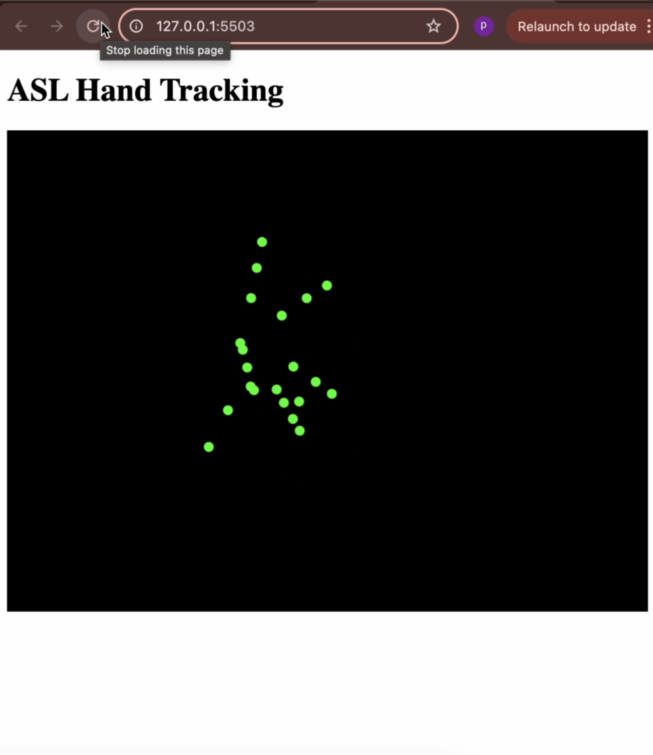 Once the backend was working, I shifted focus to the front-end interface. I used p5.js to receive the keypoint data from the WebSocket and draw it as green circles on the canvas. It was such a small visual gesture—21 dots appearing on screen wherever my hand moved—but something about it felt deeply rewarding. The fact that the circles moved when I moved my hand, and followed the same path as my physical gestures, turned the interface into a kind of mirror. I experimented with size, opacity, and layout to make it feel responsive but clean. This was the moment the system finally began to feel interactive, not just reactive.